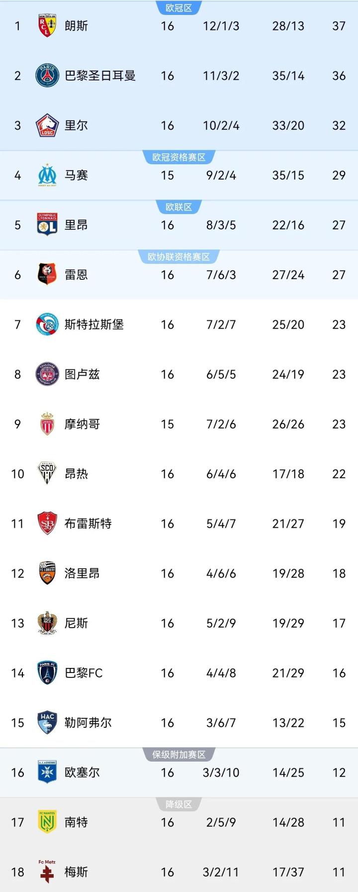 随着以上几场比赛相继结束,法甲最新积分榜也迎来更新,朗斯全取3分积37分登顶榜首,反超巴黎圣日耳曼1分,尼斯积17分排名第13位,里尔凭借胜仗排名稳步提升,欧塞尔则仍深陷降级区边缘。